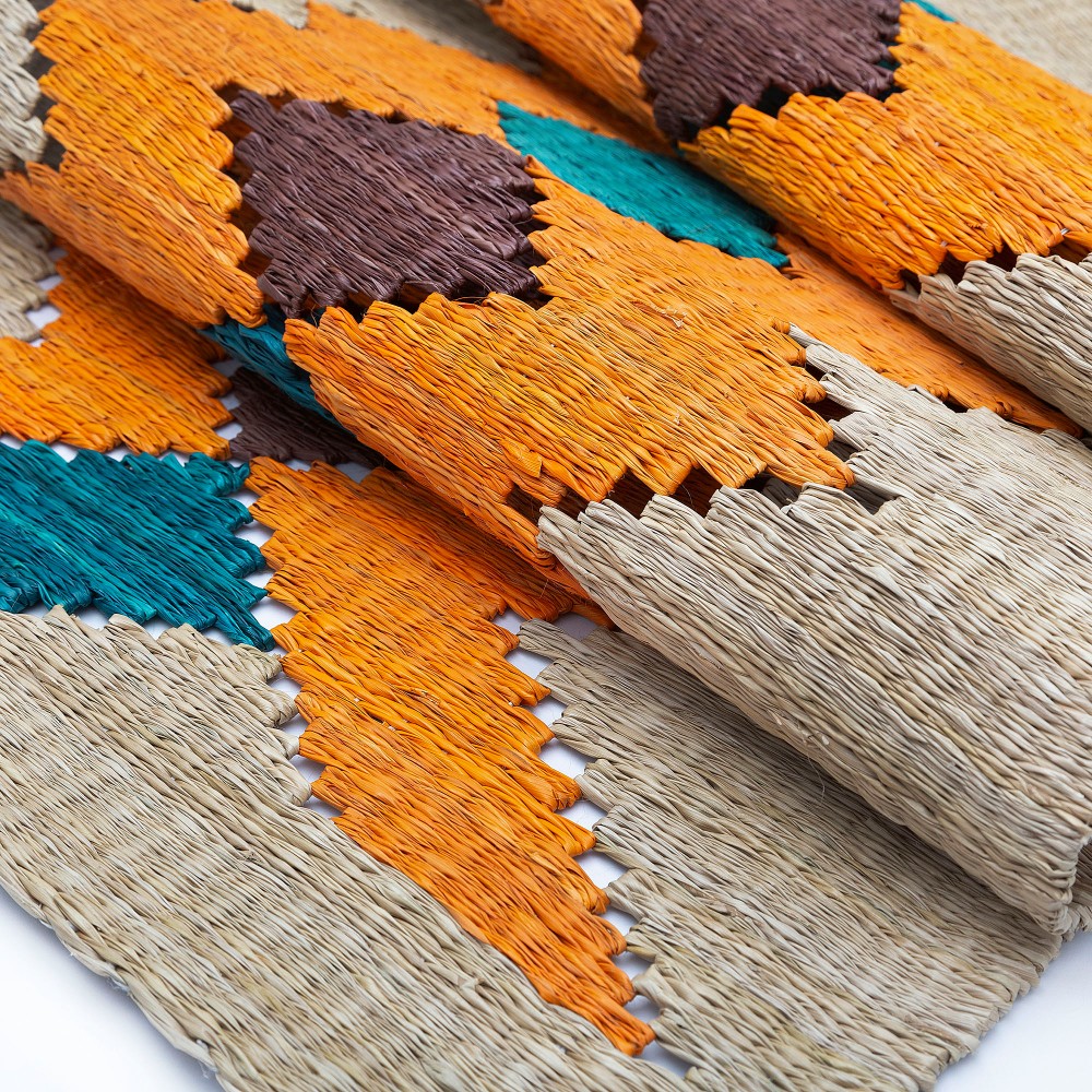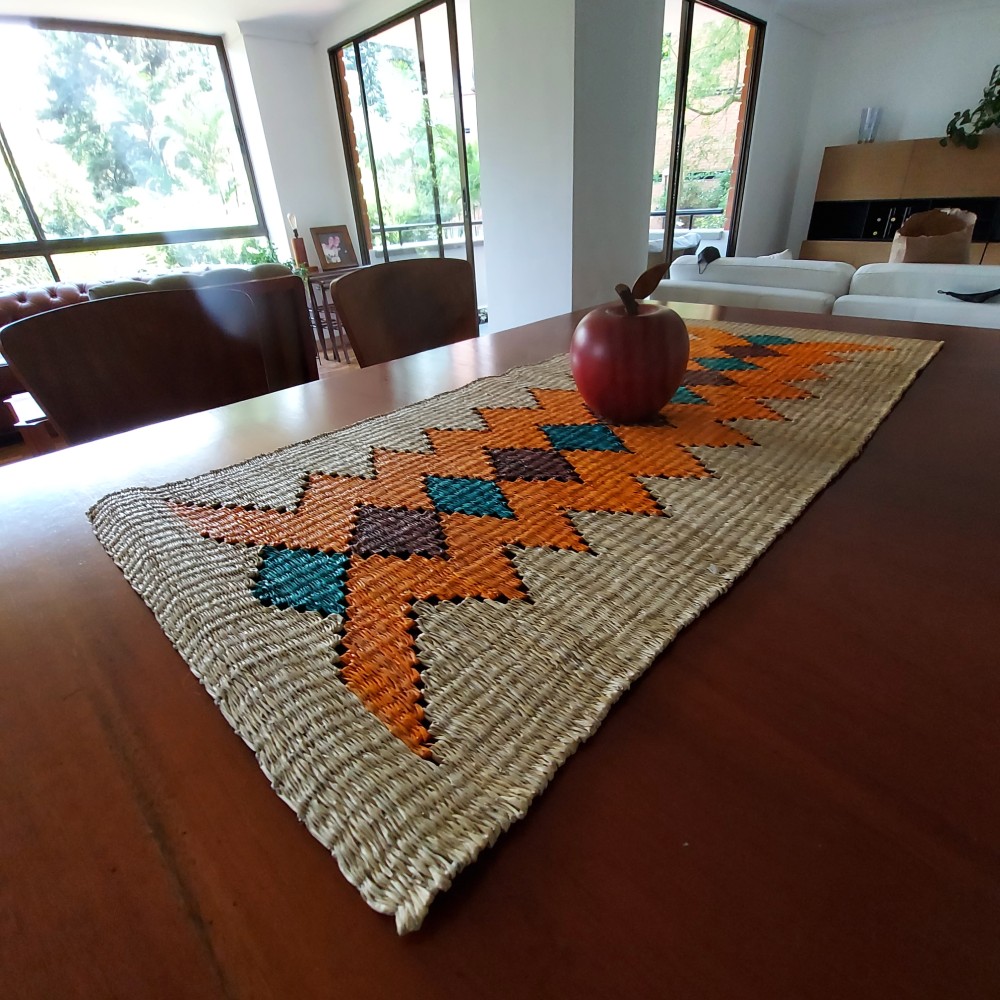 Our handwoven table runner represents a dialogue between art and tradition. Created from natural iraca palm, each piece displays colorful geometric patterns that reflect Colombia’s cultural vibrancy. The vivid orange, blue, and red tones form an elegant design that brings warmth and authenticity to any space.